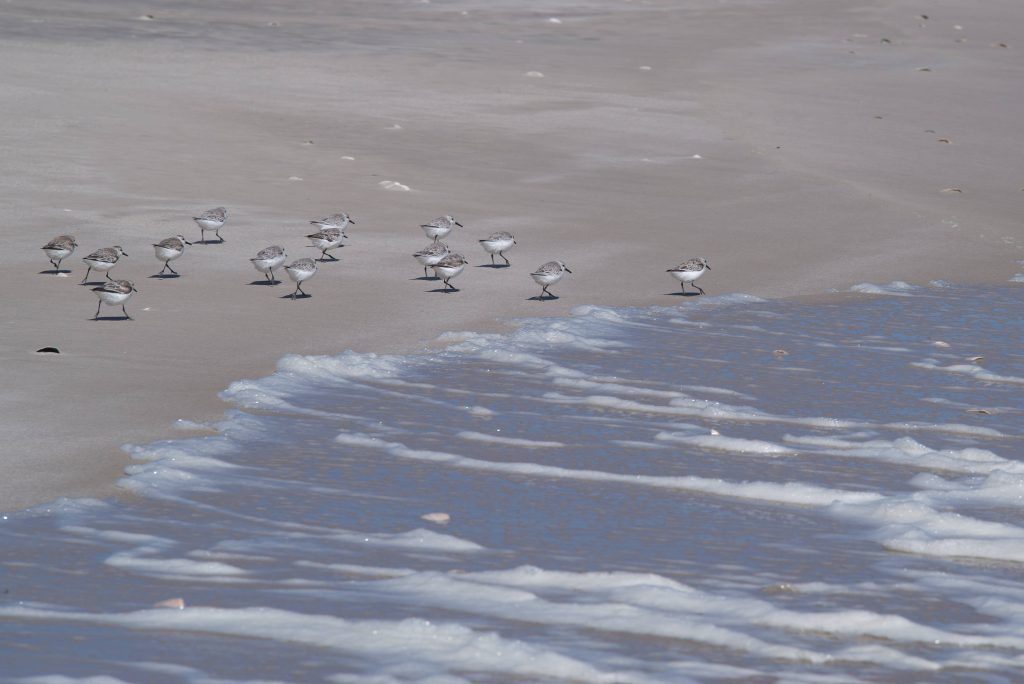 Floks of little birds running away from waves